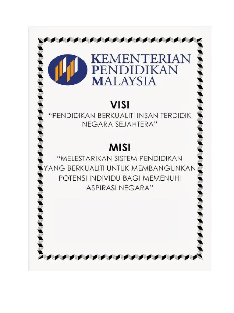 Misi • melestarikan sistem pendidikan yang berkualiti untuk membangunkan potensi individu bagi memenuhi aspirasi negara.