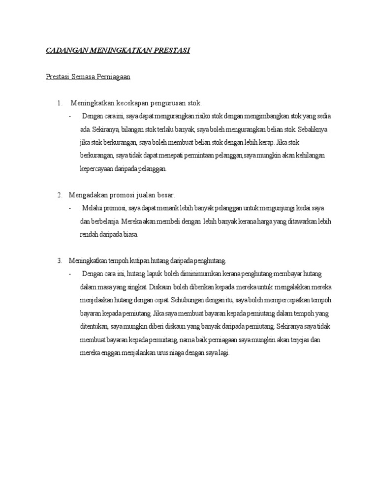 Cadangan untuk meningkatkan prestasi semasa dan prestasi jangka panjang 1) 3) menambah besarkan kedai agar lebih banyak pelanggan yang akan mengunjungi kedai.